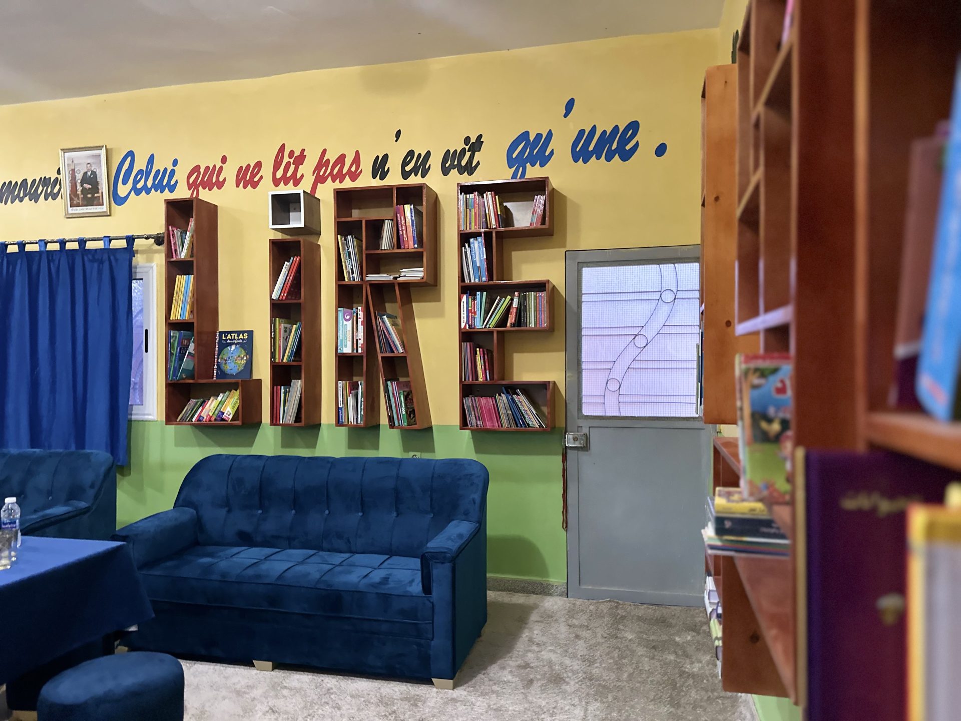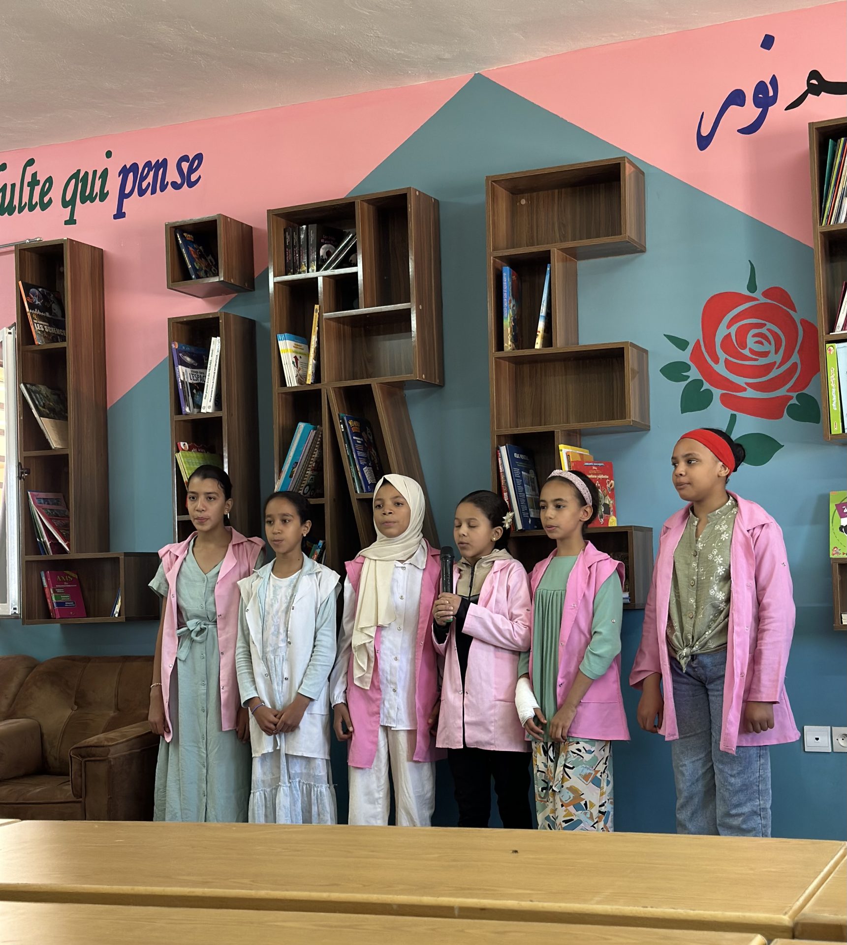 Chaque école dispose désormais d’une bibliothèque chaleureuse, pensée comme un véritable espace d’apprentissage, équipée de mobilier fabriqué par des artisans locaux et de livres en arabe et en français, afin d’ancrer durablement le plaisir de lire.